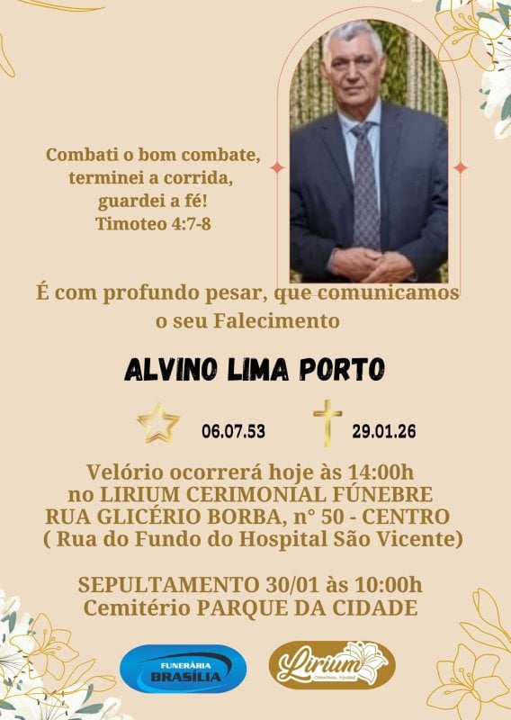 É com muito pesar que o BLOG DO ANDERSON comunica o falecimento de Alvino Lima Porto, aos 72 anos. Personalidade conhecida em Vitória da Conquista, o seu falecimento deixa profunda consternação entre amigos e familiares na Joia do Sertão Baiano. O funeral acontece no Lirium Cerimonial Fúnebre, localizado na Rua Glicério Borba, nº 50, no Centro. O sepultamento ocorrerá logo mais, às 10 horas desta sexta-feira (30), no Cemitério Parque da Cidade. Neste momento de dor e saudade, o BLOG DO ANDERSON presta solidariedade e manifesta os mais sinceros sentimentos a todos os que conviveram com Alvino Lima Porto.