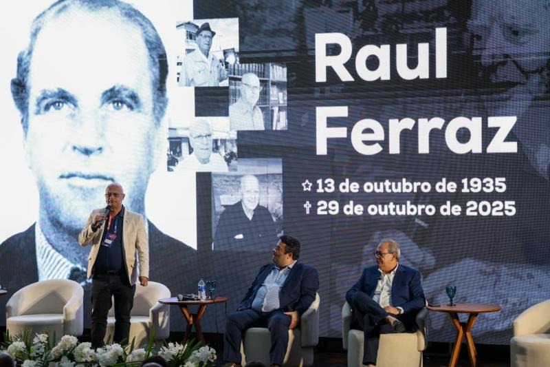 Na manhã da quinta-feira (30), segundo e último dia do 1º Encontro de Comunicação Legislativa, promovido pela Câmara Municipal de Vitória da Conquista, o vereador Luís Carlos Batista de Oliveira, do União Brasil, prestou uma homenagem emocionada ao ex-prefeito Raul Carlos Andrade Ferraz, que faleceu na quarta-feira (29), aos 90 anos de idade. O presidente do Parlamento Conquistense, Ivan Cordeiro da Silva Filho, do Partido Liberal, pediu um minuto de silêncio em respeito. Durante sua fala, Dudé destacou a importância de Raul Ferraz. “Raul Ferraz é protagonista de uma história rica. Ele é diretamente responsável por termos a cidade que temos hoje, pujante, rica, prestadora de serviços e politicamente engajada”, afirmou o parlamentar, ressaltando a influência do ex-prefeito na formação da identidade moderna de Vitória da Conquista.